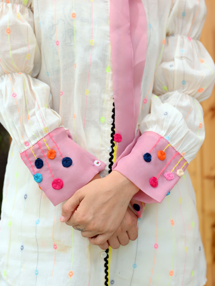 Elevate your sustainable style with our vibrant Cotton Co-ord Set, featuring playful neon blob prints and intricate hand-embroidered roses on the sleeve cuffs and tie collar. This set is not just a fashion statement but a testament to eco-conscious living. Perfect for brunches, kitty parties, and social events, it offers a blend of comfort, elegance, and a touch of whimsy for any occasion.